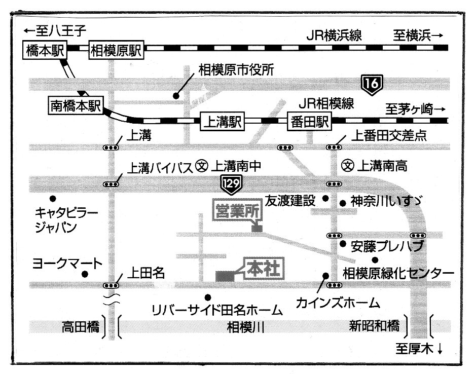 国道129号線上溝バイパスの上溝南高等学校前交差点を相模川方向へ曲がり、南下し、県道48号線との塩田中央交差点を右折、愛泉会リーバーサイト田名ホーム向いが、当社入口。上溝南高等学校前交差点から約5分。